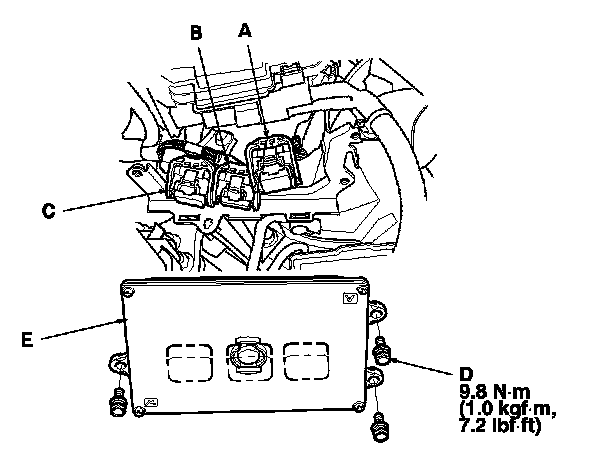 14. Remove the bolts (D), then remove the ECM/PCM (E).