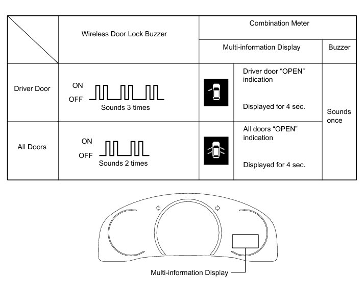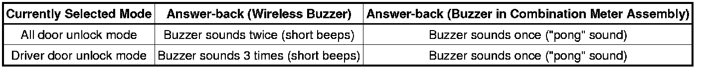 * The answer-back (wireless buzzer, buzzer in the combination meter assembly) performed for each mode is indicated in the table below.