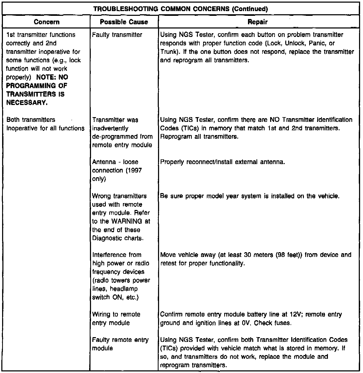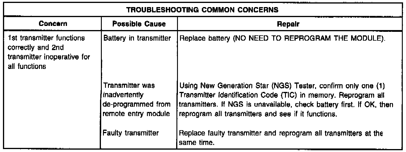B. Turn ignition to RUN or ACC. Momentarily jump pins in programming connector located in left rear quarter panel area. All doors will lock then unlock to confirm programming mode. Press any button on 1st transmitter. Door locks will lock then unlock to confirm programming. Press any button on 2nd transmitter (up to 4 transmitters total possible). The door locks will lock then unlock to confirm programming. Turn ignition to OFF. Locks will again cycle to indicate end of programming mode.