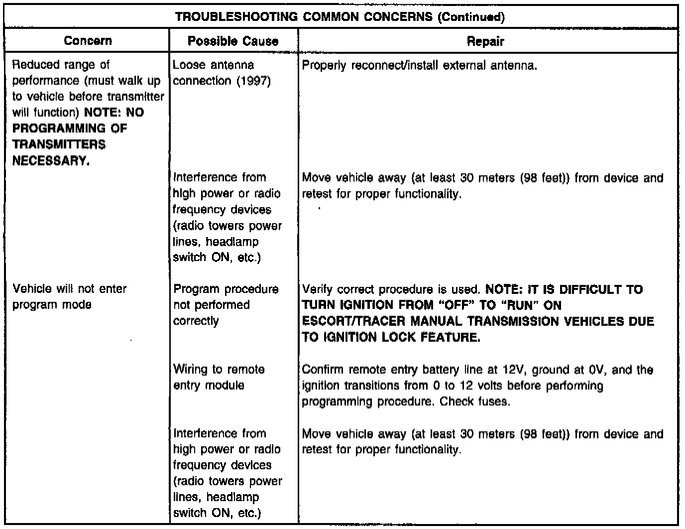 ESCORT/TRACER WITH SINGLE DOOR REMOTE ENTRY SYSTEMS WILL CYCLE THE DRIVER'S DOOR LOCK ONLY.