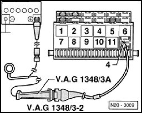 - Connect V.A.G 1348/3A remote control with V.A.G1348/3-2 remote control connection to terminal 4 and B+.