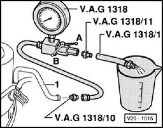 - Connect V.A.G 1318/1 hose to V.A.G 1318/11 adapter of pressure gauge and hold in a measuring container.