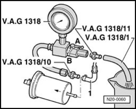 - Connect pressure gauge (V.A.G 1318) with adapter (V.A.G 1318/10) to fuel supply line -1-.